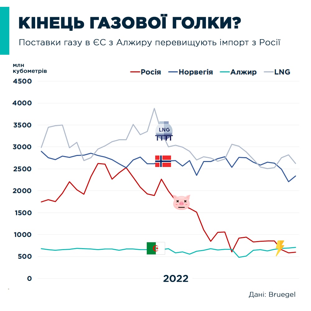 Тим часом Росія добиває ногами свою "курку, що несе золоті яйця" - самосанкції призвели до того, що невеликий імпортер Алжир наразі поставляє до ЄС більше блакитного палива, аніж країна-бензоколонка 🐷.