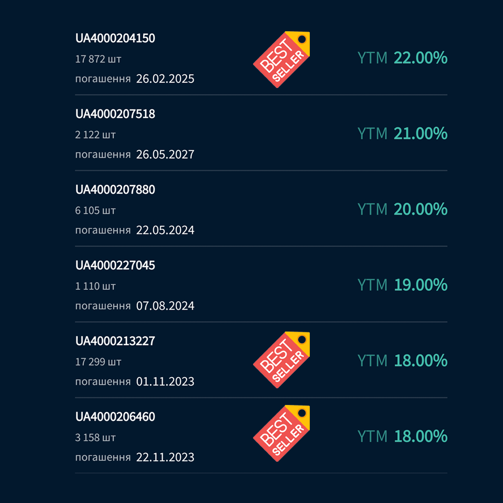 Бестселери в ICU Trade цього тижня - дворічні ОВДП з дохідністю 22% річних та випуски з погашенням у листопаді цього року під 18%.
