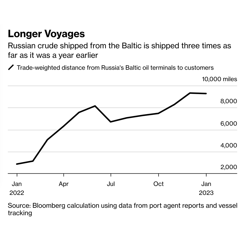 🚢 Довші подорожі означають більше часу в морі й потребують більшої кількості суден для забезпечення доставки. За розрахунками Bloomberg танкеру потрібно 66 днів, щоб виконати рейс в обидва кінці з Балтики або Арктики до західного узбережжя Індії, якщо немає значних затримок у розвантаженні.
