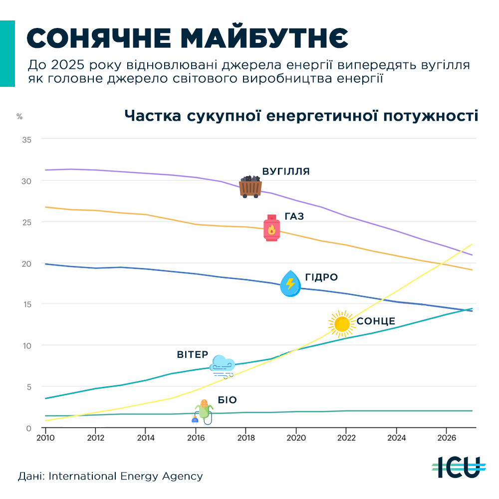 📈 Міжнародне енергетичне агентство прогнозує, що відновні джерела енергії (сонце, вітер, біопаливо) випередять вугільну генерацію й стануть основним джерелом енергетичних потужностей у світі вже у 2025 році.