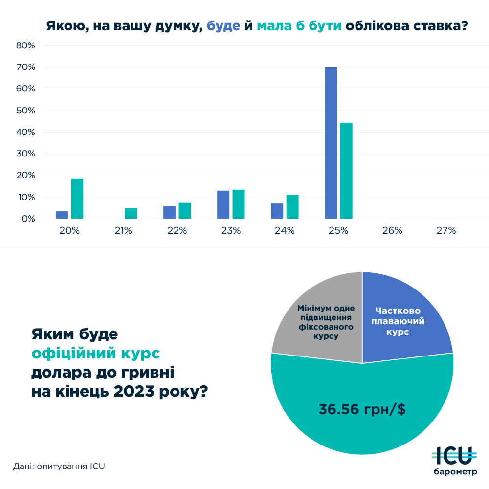 ➡️ Щодо офіційного курсу 50+% респондентів очікують штилю й збереження курсу 36.6 грн/$ до кінця року. Ще по 23% бачать попереду одне підвищення фіксованого курсу. Ще така ж частка відчуває готовність України перейти до певного формату плаваючого курсу вже цього року.