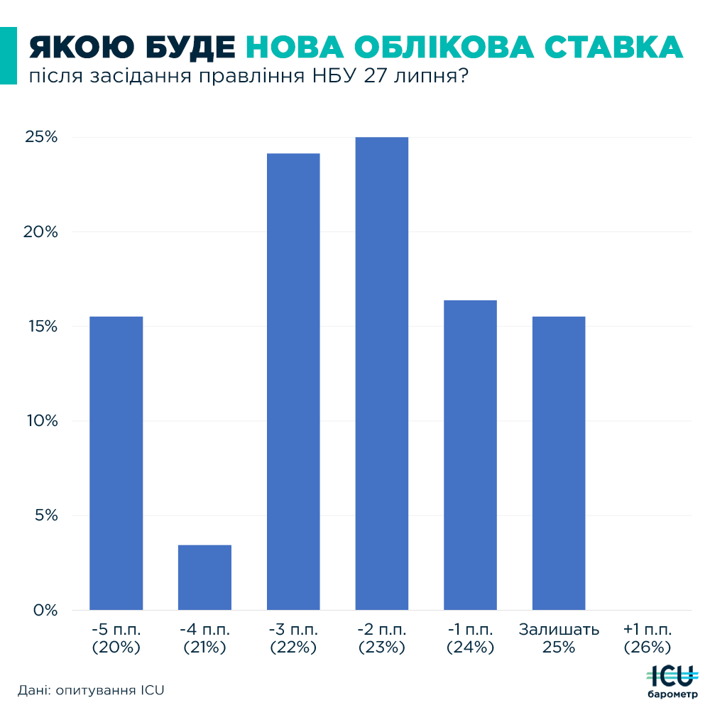 ➡️ Лише кожен шостий вважає, що Нацбанк поки не чіпатиме ставку. Тим часом майже 70% очікує зниження ставки на 2 процентні пункти й більше — з них понад 15% готові побачити сьогодні відразу ставку 20%.
