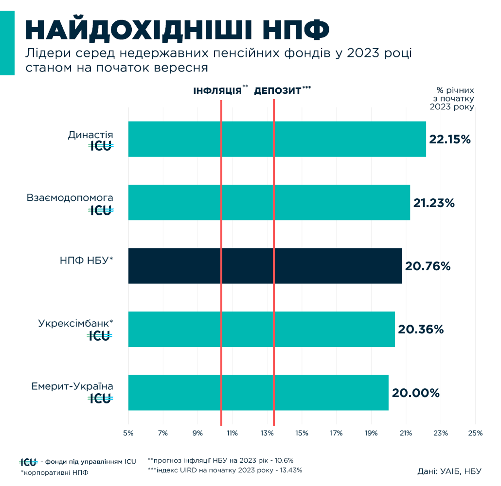 📈 4 з 5 найдохідніших недержавних пенсійних фондів України з початку цього року — це фонди, якими керує ICU. У 2023 році попри все ще складні економічні умови наші фонди відчутно випереджають темпи інфляції та середні ставки за депозитами.