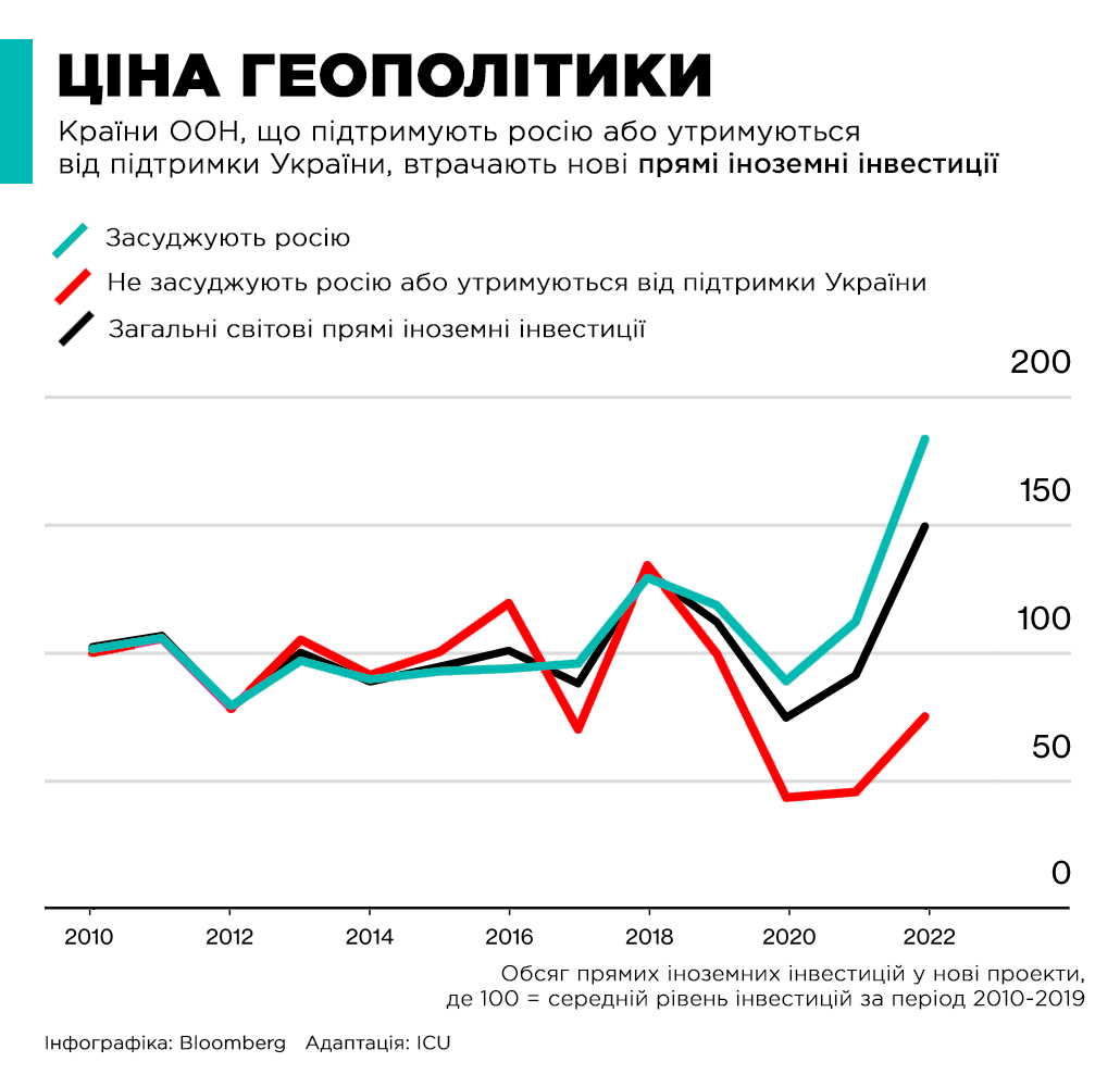 🗳️ Bloomberg проаналізував, що міжнародні інвестори скорочують прямі інвестиції в країни, які під час голосувань в ООН не засуджують росію або утримуються. Країни, які підтримують Україну, зокрема США та деякі країни G7, навпаки мають приплив іноземних інвестицій.