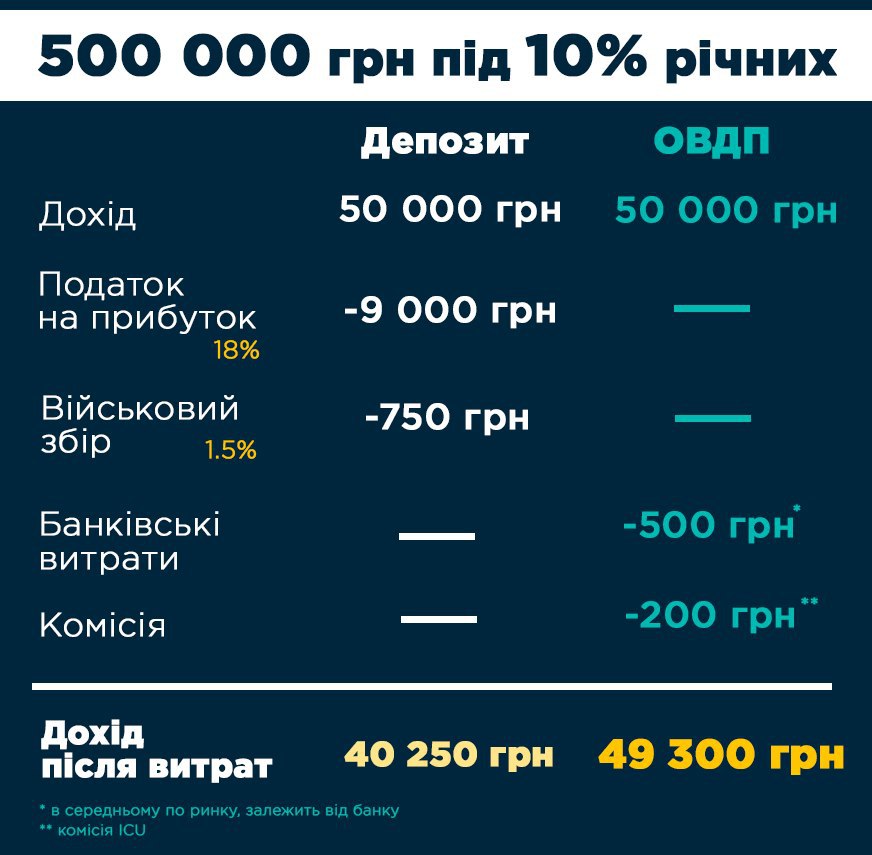 Підготували для вас невеличке порівняння різниці прибутку від інвестиції 500 000 грн в ОВДП та депозит з дохідністю 10%. Цифри говорять самі за себе - за співмірних ставок ОВДП можуть бути прибутковішими.