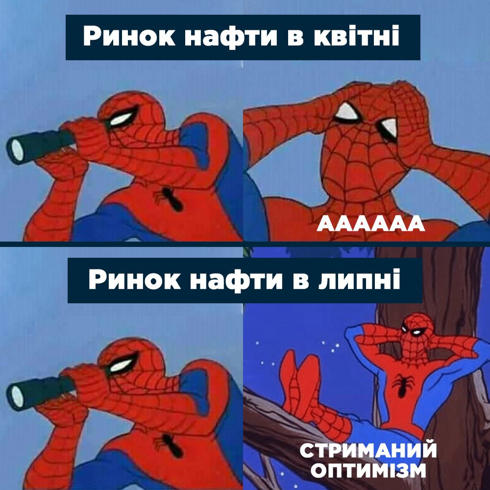 Що ж, як то часто буває, життя виявилося прозаїчнішим за меми - ситуація стабілізувалася, ціна марки Brent за три місяці майже подвоїлася з $20 до $43 за барель. Ралі триває.