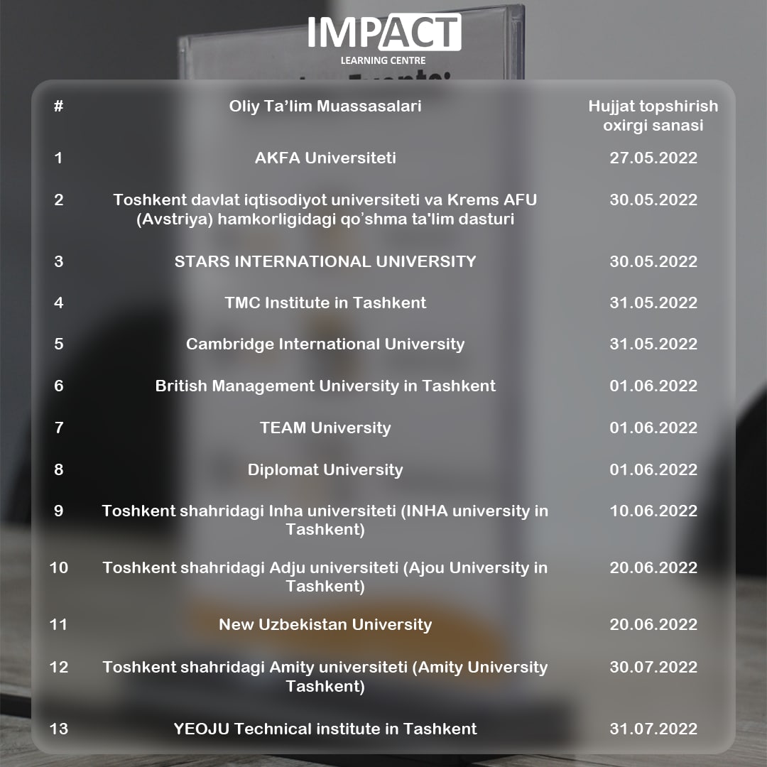 👇 Shuning uchun quyida rasmda ba'zi universitetlarga hujjat topshirishning oxirgi sanalari bilan bo'lishdik.