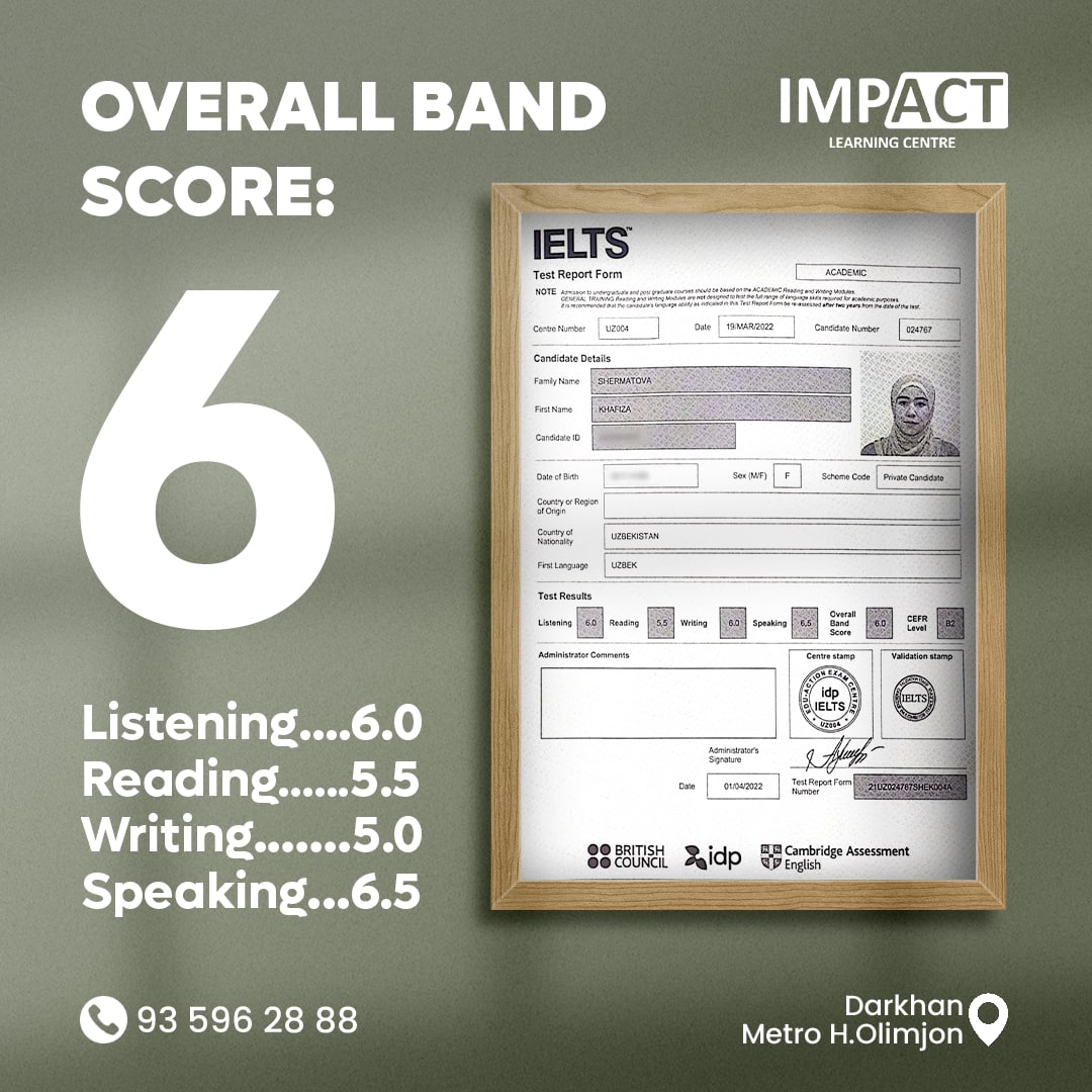 🤩 Shermatova Khafiza bizning IELTS Full kursimizda tahsil olib o'zlari ko'zlagan natijani qo'lga kiritdilar.