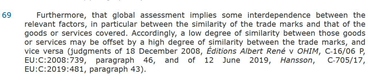 Ключевой вывод суда (п. 69): низкая степень сходства обозначений компенсируется тождеством или высокой однородностью тех товаров, для которых знак регистрируется, и наоборот. При этом степень сходства между обозначениями усиливается, если ранее зарегистрированное обозначение обладает крайне высокой различительной способностью.
