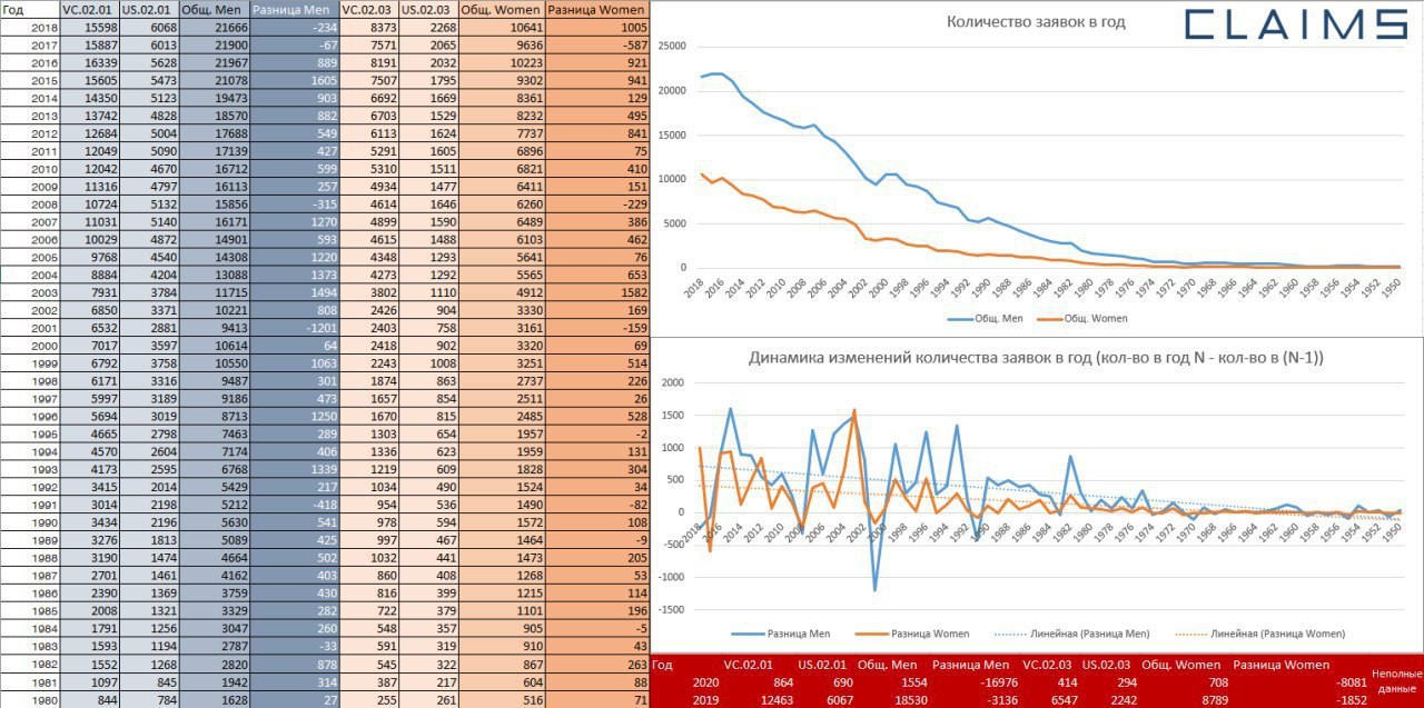 Кстати, для любителей поработать со статистикой есть вот такая таблица (пример ниже), там вы можете найти данные с 1905 по 2020 год, графики с общим количеством заявок в год и разбивку по каждому коду. Наслаждайтесь!