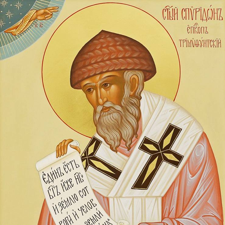 Собора Перваго показался еси поборник и чудотворец,/богоносе Спиридоне,отче наш./Темже мертву ты во гробе возгласив / и змию в злато претворил еси,/ и внегда пети тебе святыя молитвы,/Ангелы,сослужащия тебе имел еси, священнейший./Слава Давшему тебе крепость,/слава Венчавшему тя,// слава Действующему тобою всем исцеления.Святителю отче Спиридоне моли Бога о нас.