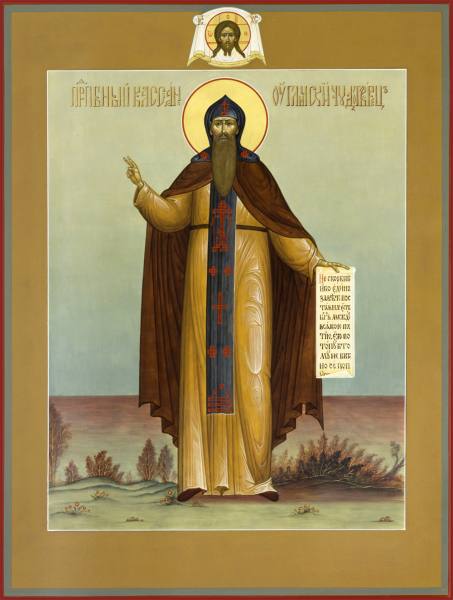 Угличский преподобный, в миру князь Константин Мангупский, родственник последнего греческого императора Константина Палеолога, приехал в Россию с его племянницей Софией, невестой вел. кн. Иоанна III Васильевича. Знатным грекам ее свиты раздавали высокие придворные места и звания, но богомольный и смиренный кн. Константин принял лишь скромную должность ближнего боярина при Ростовском архиепископе Иоасафе (в миру — князь Оболенский). В 1489 г. владыка Иоасаф удалился на покой в Ферапонтов монастырь. Князь сопровождал его, хотя об иночестве еще не думал. Но в первую же ночь ему явился во сне прп. Мартиниан Белоезерский и, угрожая ему своим посохом, потребовал, чтобы князь постригся. Потрясенный видением, князь Константин покорился. Ему нарекли имя Кассиан. Тяжелые монастырские работы не устрашили смиренного духом бывшего князя, в безмолвии, молитве и строгом послушании он скоро превзошел всю братию.
