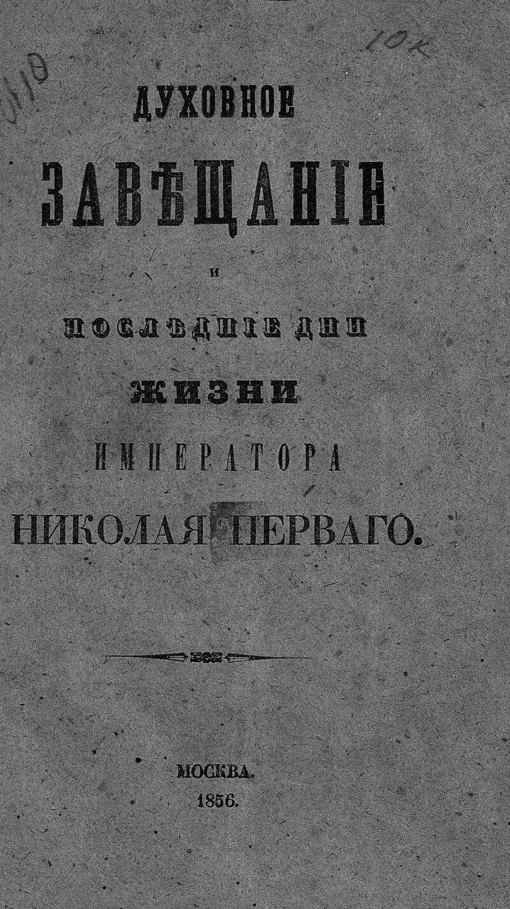 Завещание кончалось так: «Вот, любезный Саша, в коротких словах мое последнее тебе наставление. Да благословит тебя Бог всемилосердный, на Него одного возлагай всю свою надежду. Он тебя не оставит, доколе ты к Нему обращаться будешь. Ступай смело — и велик Бог русский. Николай. Александрия. 30 июля 1835 г.».