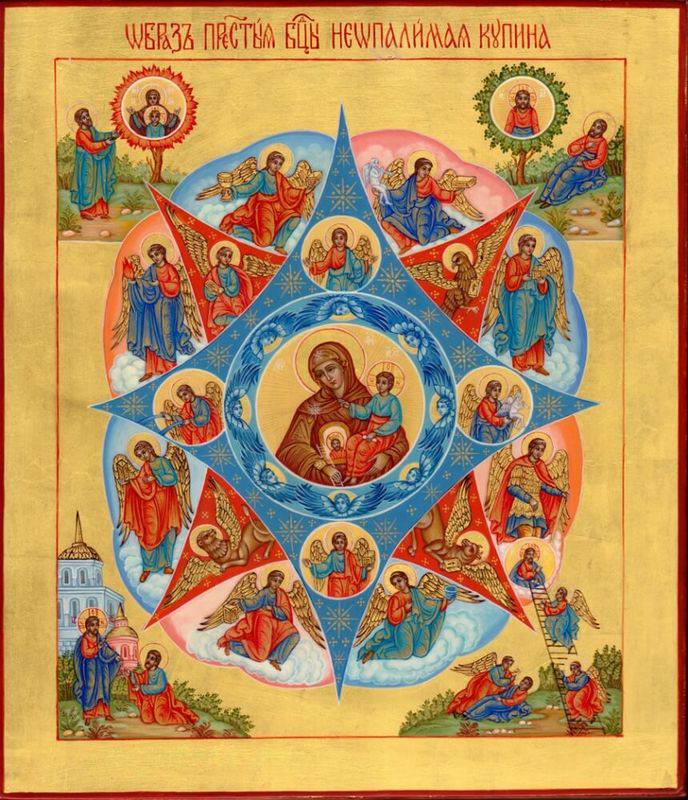 Куст купины был одним из ветхозаветных прообразов Богоматери. Купина горит и не сгорает — Дева рождает и пребывает Приснодевою, родившаяся на грешной земле Сама пребывает вечно Пречистою. Икона «Неопалимая Купина» — образ поистине космического звучания. Он подытоживает православное представление о Богородице-Церкви-Софии во всей красоте Ее вневременного и вселенского значения.