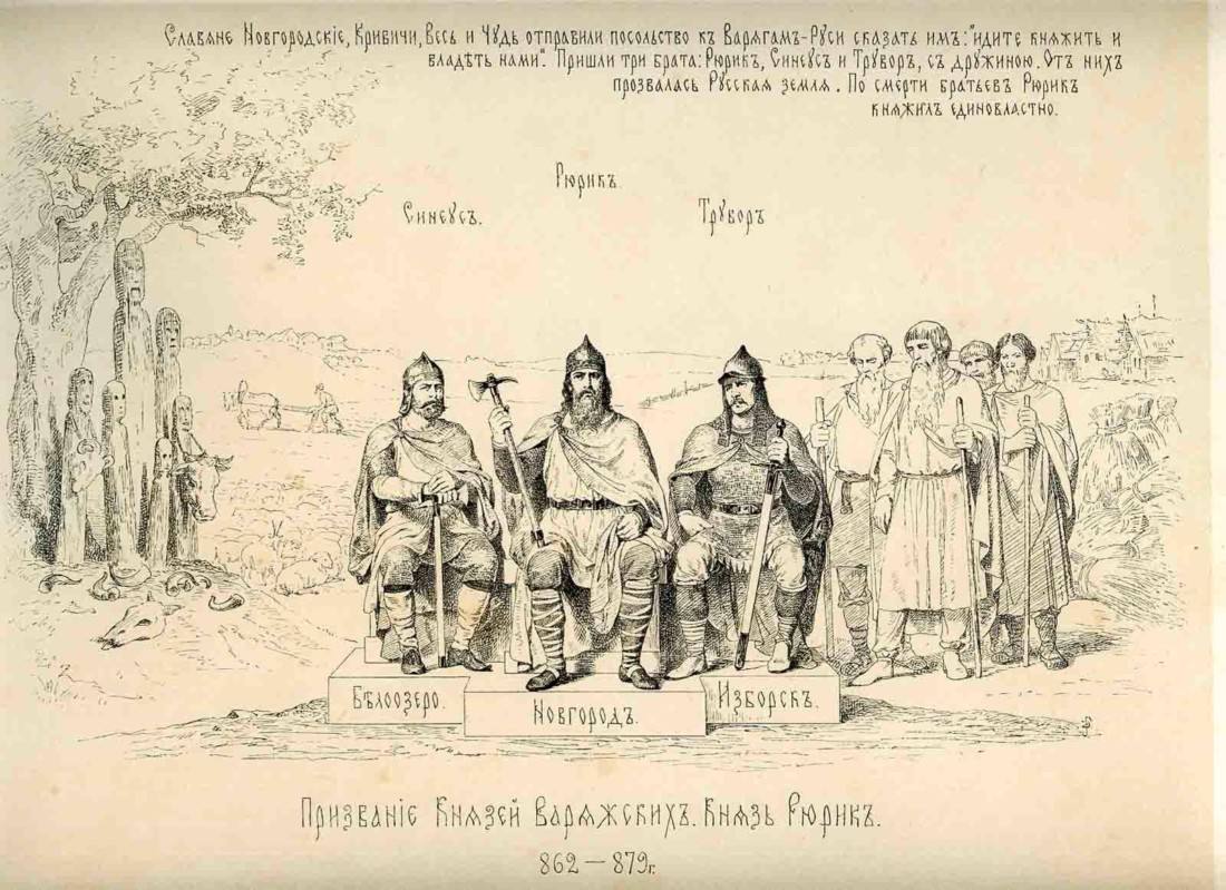 Призвание новгородцами на княжение трех братьев-варягов: Рюрика, Синеуса и Трувора.