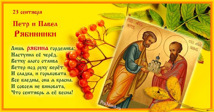 Олицетворением солнца в доме считались ягоды рябины их убирали на повети, заготавливали на зиму, развешивали кистями. Считалось, что с деревьев не следует всю ягоду собирать, а оставлять дроздам, снегирям и другим птицам для прокорма. Была примета: много ягод на рябине - строгая зима, поэтому заготавливали рябиновый квас, который помогал зимой от простуд. В этот день крестьяне просили свв. Петра и Павла, чтобы они помогли им перезимовать. Именины празднуют: Андрей, Апеллий, Иоасаф, Каллиник, Касьян, Климент, Лукий, Минодора, Митродора, Нимфодора, Павел, Пётр, Пульхерия.