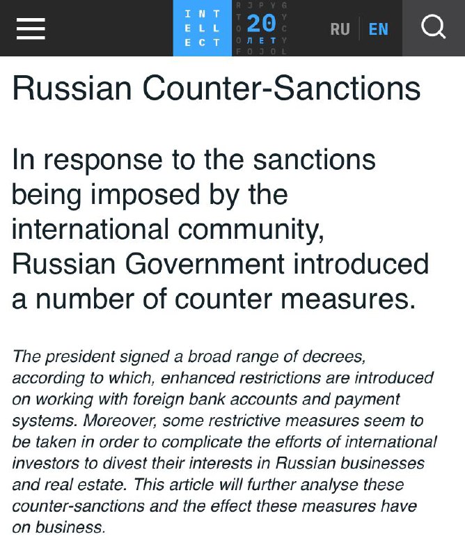 Сводный материал на английском языке, посвящённый российским контрсанкциям – может пригодиться для ваших иностранных партнёров.
