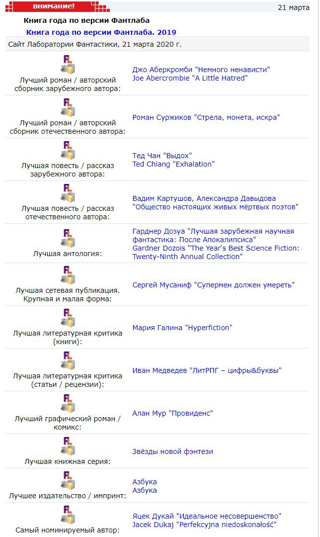 «ФантЛаб» тем временем объявил итоги голосования по «Книге года». Среди лауреатов – «Выдох» Теда Чана (номинация «Лучшая повесть / рассказ зарубежного автора»), антология под редакцией Гарднера Дозуа «Лучшая зарубежная научная фантастика: После Апокалипсиса»/The Year's Best Science Fiction: Twenty-Ninth Annual Collection (номинация «Лучшая антология»), «Провиденс» Алана Мура (номинация «Лучший графический роман / комикс»).