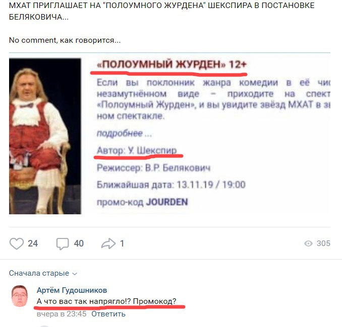 - А что вас так напрягло, промокод? – недоумевает в комментах начальник информационного отдела МХАТа.