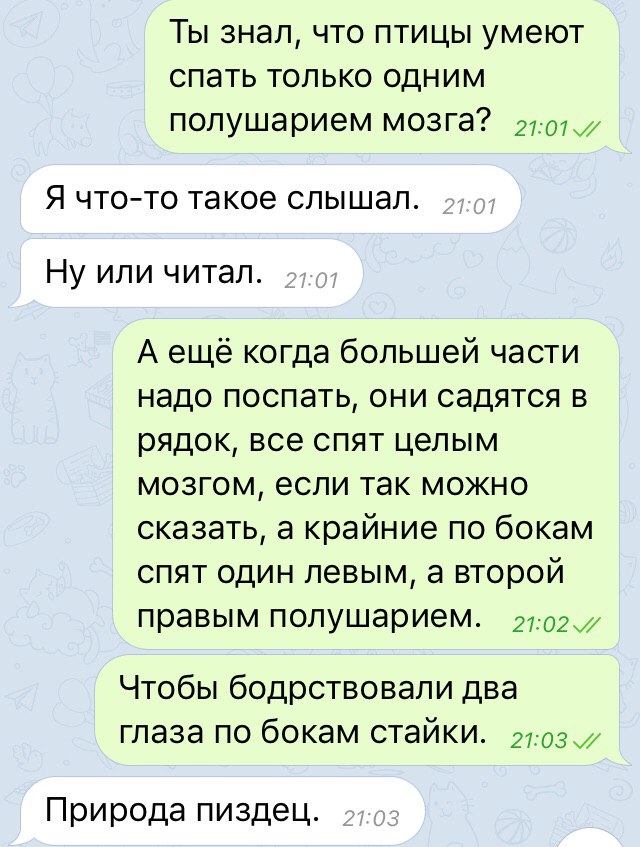 А ещё в «Зачем мы спим» классный кусок про зверей и птиц. Я такое обожаю. Пополнила свои запасы невероятно важных фактов, которые обязательно понадобятся (в коллекции уже есть знание, как выглядит член хорька и почему он выглядит именно так).