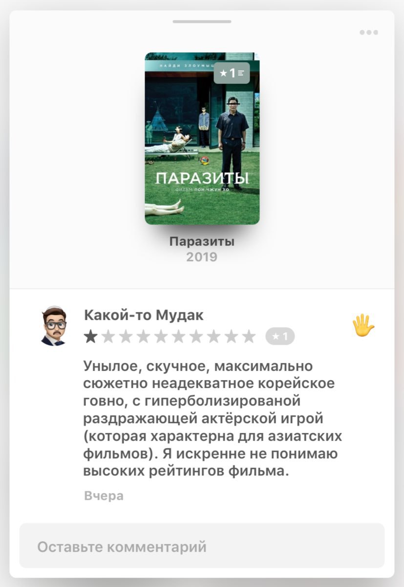 Я не люблю конкретно указывать чем мне понравился или не понравился фильм, это сразу подводит людей к определённому мнению, и по этой же причине я не смотрю обзоры до того, как я схожу на фильм. Мнение я должен составить сам и уже потом дополнять его какими-то деталями из вне. Ну вот чисто оценки можно глянуть, но не более.