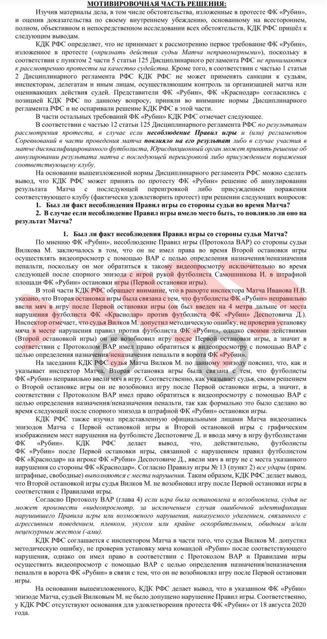 В оконцовке КДК добавляет, что правила протокола ВАР, а также регламент проведения чемпионата утверждают, что ошибки судьи, связанные с ВАР, НЕ являются основанием для аннулирования итогов матча. Вдобавок, согласно дисциплинарному регламенту РФС, КДК НЕ принимает претензии к качеству судейства и НЕ имеет права применять какие-либо санкции к судьям.