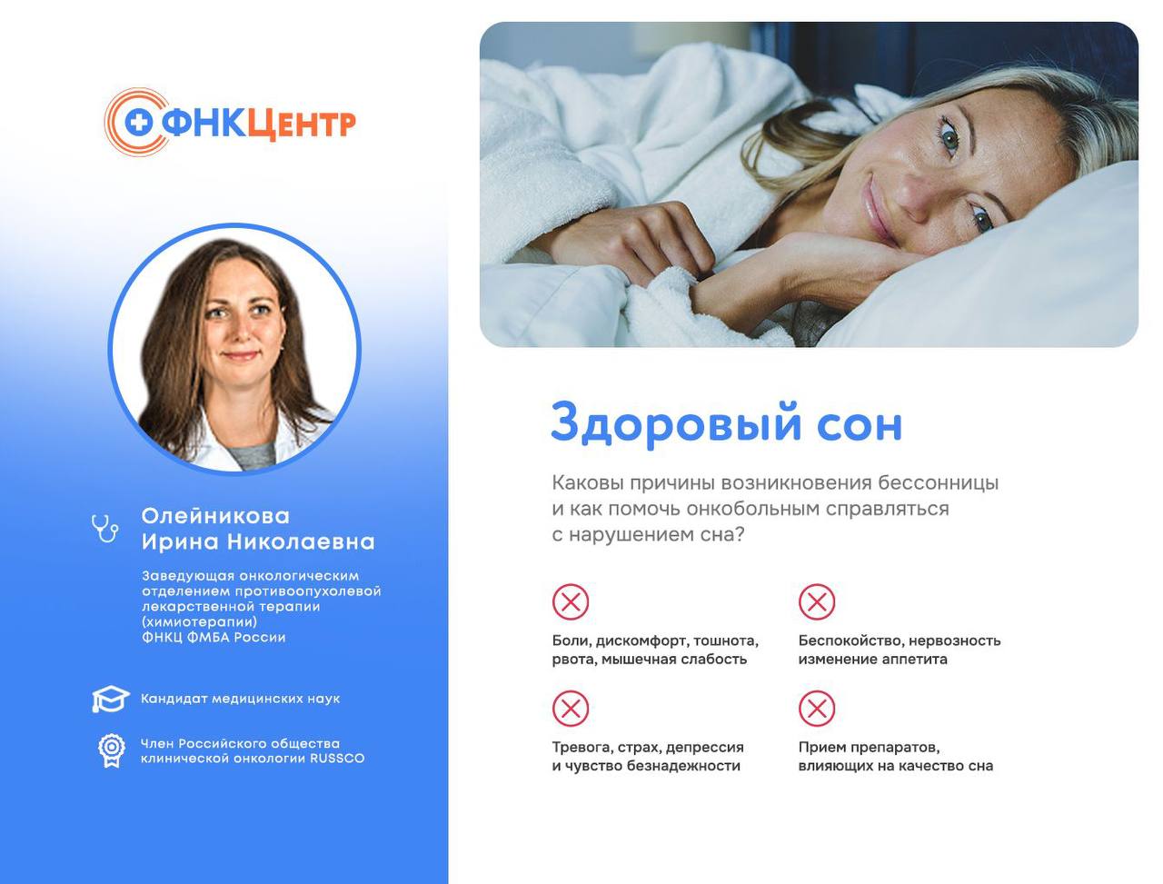 "Здоровый сон очень важен для организма пациента на различных уровнях- его влияние на иммунную систему, нейроэндокринную функцию, когнитивную функцию, общее самочувствие играет огромную роль в поддержании качества жизни в целом. Бессонница — это расстройство сна, при котором человек испытывает трудности с засыпанием или поддержанием сна. Каковы причины возникновения бессонницы и как помочь онкобольным справляться с нарушением сна?