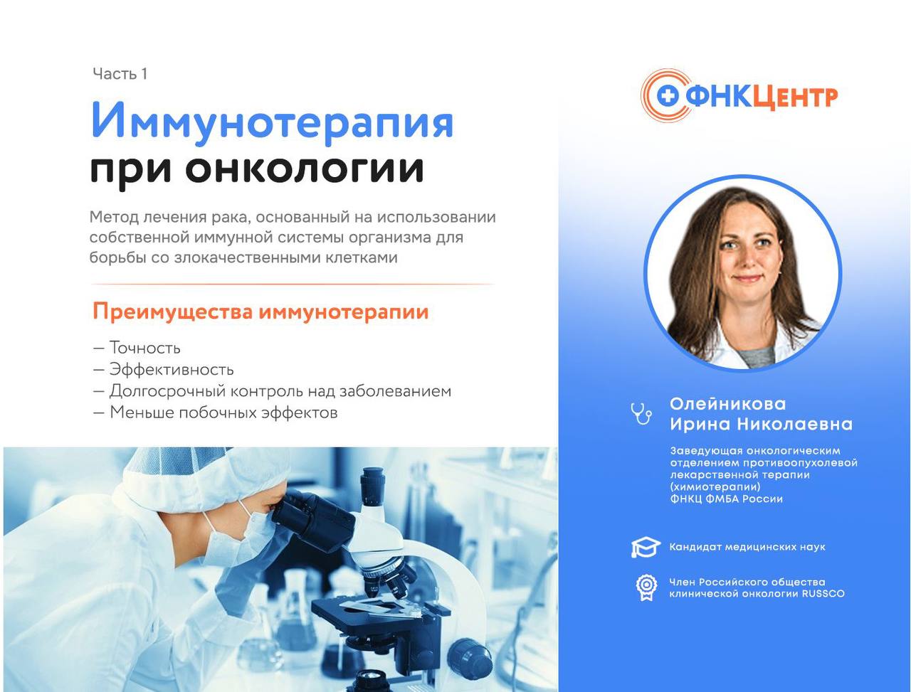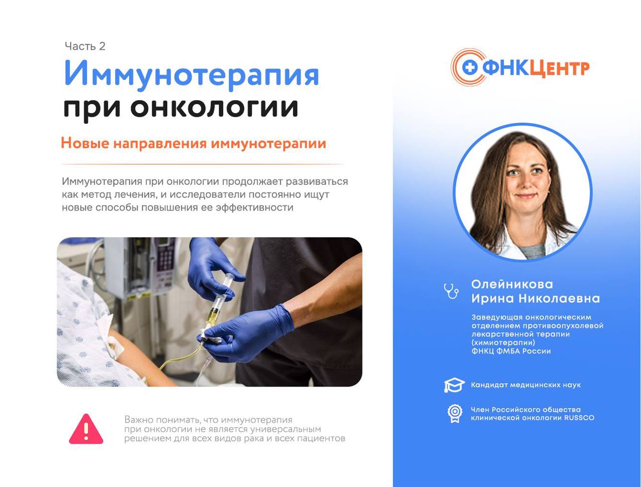 Часть 1 Каждый год миллионы людей по всему миру сталкиваются с диагнозом «рак». Онкологические заболевания представляют собой серьезную угрозу для здоровья и жизни пациентов. Однако, в последние годы наука сделала огромный шаг вперед в лечении рака с помощью инновационных технологий, и одним из главных прорывов стало внедрение иммунотерапии. Ирина Олейникова, Заведующая онкологическим отделением противоопухолевой лекарственной терапии (химиотерапии) ФНКЦ ФМБА России специально для читателей канала «Ты не один» расскажет о преимуществах и особенностях данного метода лечения онкологии.