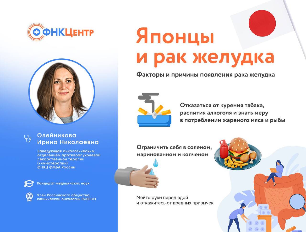 Во многом данная негативная тенденция объясняется культурой питания. В Японии, например, в повседневном рационе практически отсутствуют свежие овощи, полезные для пищеварения. Группа исследователей из Японии выявила, что в 50% случаев рак можно предотвратить . Для этого нужно отказаться от курения табака, распития алкоголя и знать меру в потреблении жареного мяса и рыбы. Заболеваемость раком желудка может снизиться из-за улучшения рациона питания. Необходимо потреблять больше овощей и фруктов. Так как риск заболеть у мясоедов выше, чем у тех, кто любит растительную пищу . Также необходимо ограничить себя в соленом, маринованном и копченом. Так как одной из причин развития рака считают бактерию Helicobacter pylori . Она вызывает хронический гастрит и язву из-за чрезмерного употребления вредной пищи. Группа риска За период с 1977 по 2024 год были обнаружены большие изменения в структуре смертности от рака в Японии. Так, «Японский фонд исследования рака» выявил, что в 2014 году из группы риска вышли молодые люди, в то время как из-за увеличения продолжительности жизни возросла смертность от рака желудка у пожилого населения . Япония стремится к предотвращению развития рака у молодых людей женского и мужского пола. Они ввели такие меры, как проведение фиброгастроскопии с 18 лет . Простыми словами это обязательный осмотр живота. Система профилактических мер в Японии улучшается с каждым годом, чтобы диагностировать рак на ранних стадиях и принять необходимые меры лечения. В России каждый житель может бесплатно пройти комплексное обследование – диспансеризацию. Гастроскопия не входит в список обязательных процедур, но может быть назначена на втором этапе при подозрении на онкологию. Стоимость процедуры на платной основе варьируется от 2 до 5 тыс. рублей в зависимости от сложности Так, у людей, предпочитающий здоровый образ жизни намного ниже риск заболевания раком. Ешьте только полезную пищу, мойте руки перед едой и откажитесь от вредных привычек.