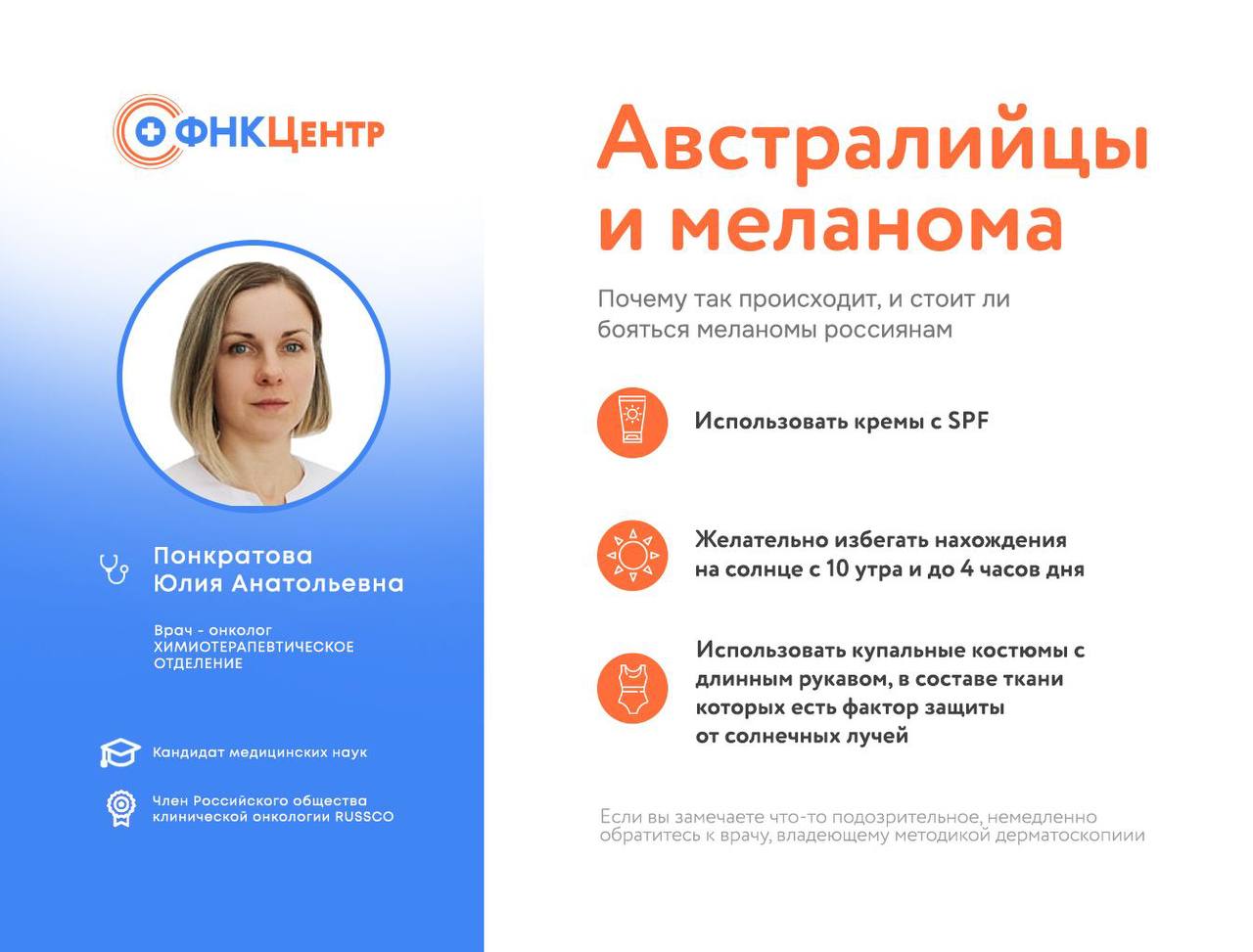 Друзья, сегодня хотим поговорить о серьезном заболевании - меланоме. Этот вид рака кожи может быть смертельно опасным. Особенно подвержены риску возникновения данного недуга жители «солнечных» стран, и самый яркий пример - Австралия. Почему так происходит, и стоит ли бояться меланомы россиянам – разобрали с Юлией Понкратовой, Врачом - онкологом ФНКЦ ФМБА России, Кандидатом медицинских наук, Членом Российского общества клинической онкологии RUSSCO, Общества специалистов поддерживающей терапии в онкологии RASSC.