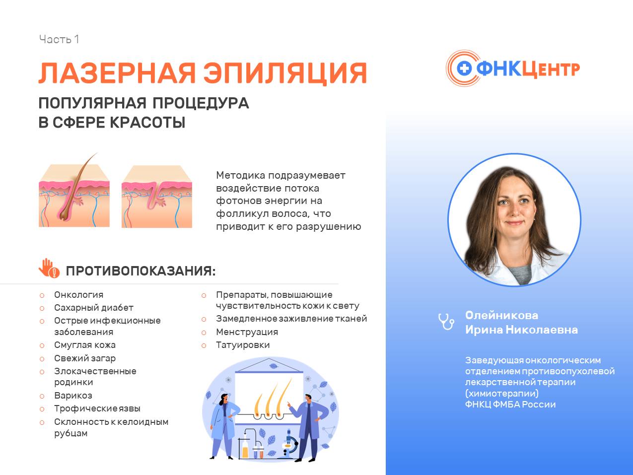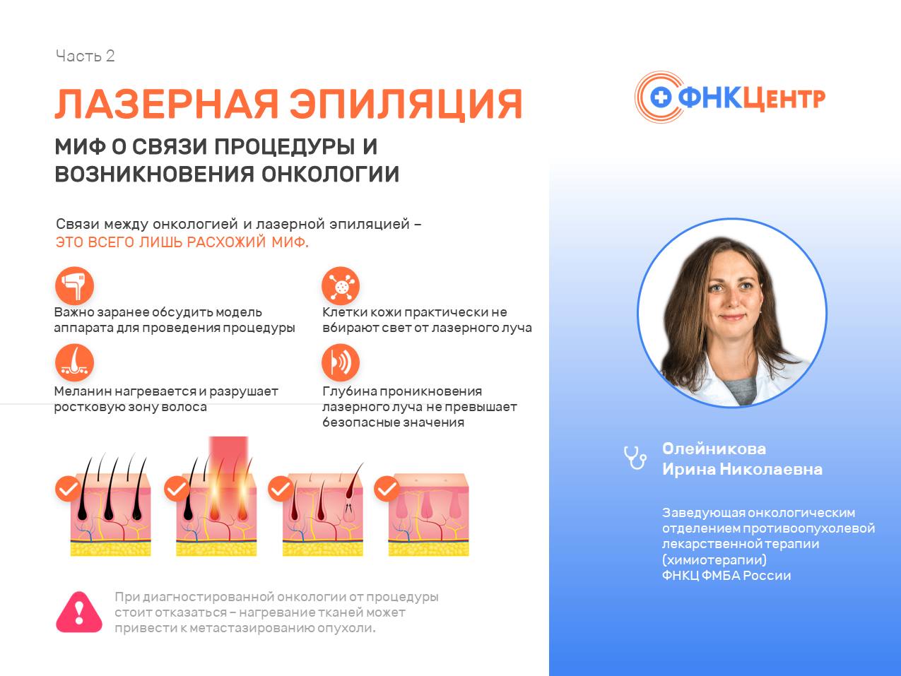 Лазерная эпиляция – одна из самых популярных процедур в сфере красоты на сегодняшний день. Методика подразумевает воздействие потока фотонов энергии на фолликул волоса, что приводит к его разрушению. Курсы проводятся с интервалом в несколько месяцев, что дает возможность длительное время не думать о повторном удалении волос. Редакция канала «Ты не один» совместно с Ириной Олейниковой, Заведующей онкологическим отделением противоопухолевой лекарственной терапии (химиотерапии) ФНКЦ ФМБА России развеяли популярный миф о связи процедуры и возникновения онкологии.