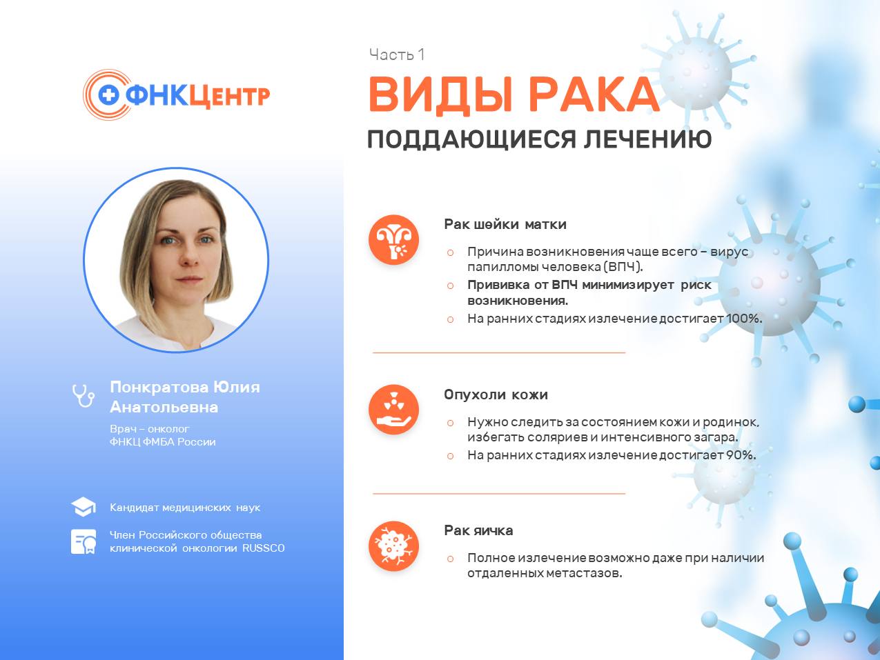 Рак – общее название для целого ряда онкологических заболеваний, которые имеют разное происхождение, природу, по-разному протекают и лечатся. Некоторые виды рака достаточно тяжело поддаются лечению, а вот с другими медицина научилась бороться сравнительно быстро и легко. Рассказывает Юлия Понкратова, врач-онколог ФНКЦ ФМБА России.