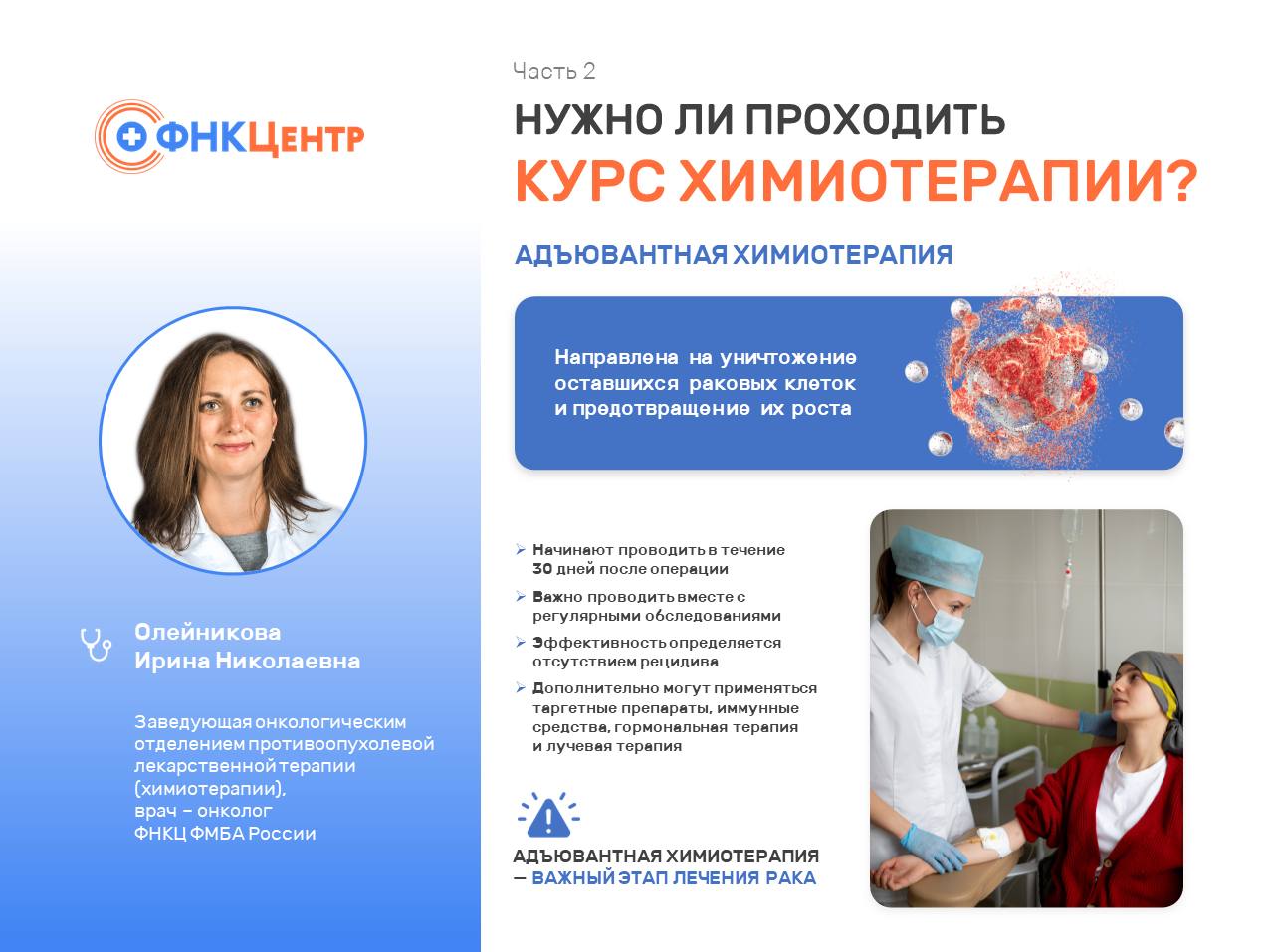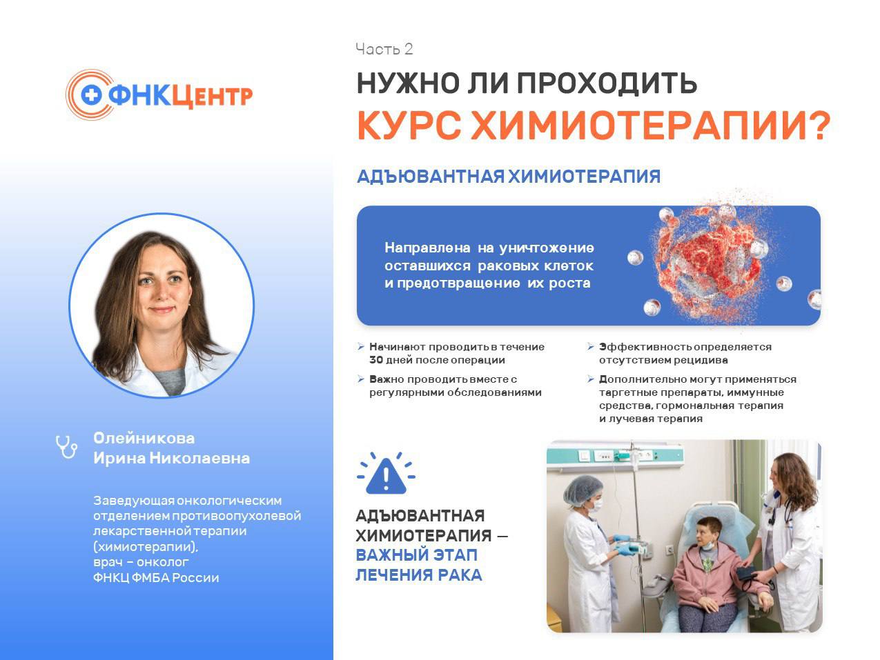 После успешного удаления злокачественной опухоли и подтверждения отсутствия признаков оставшегося рака в организме возникает вопрос: нужно ли проходить курс химиотерапии? На этот вопрос ответит Ирина Олейникова, заведующая онкологическим отделением противоопухолевой лекарственной терапии (химиотерапии), врач - онколог ФНКЦ ФМБА России. Часть 2