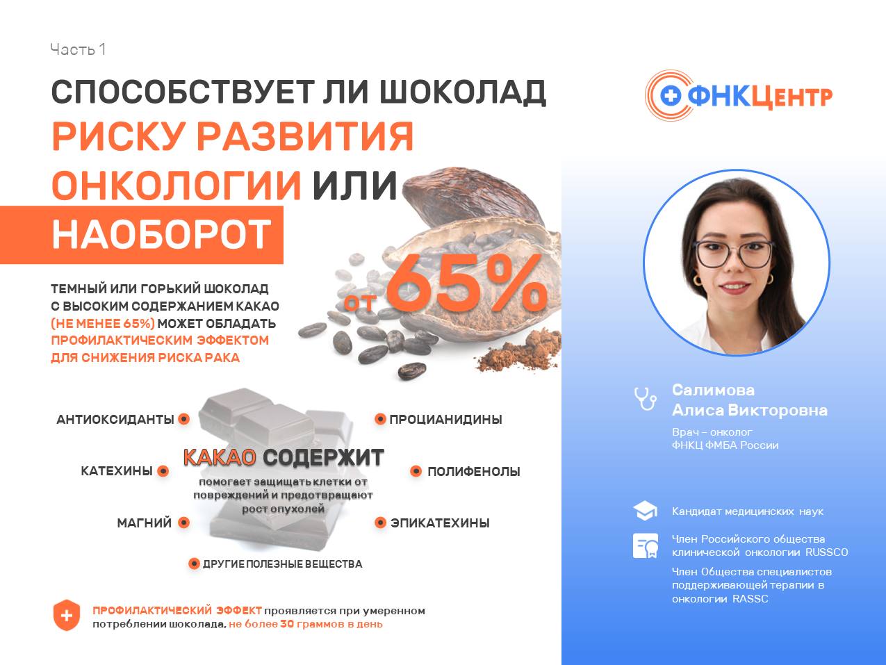 Вы когда-нибудь задумывались о том, что такой привычный продукт как шоколад может быть одновременно врагом и другом нашего здоровья? И дело не только в лишнем весе или повышении настроения - его влияние на организм может быть более сложным. Разбираемся с Алисой Салимовой, врачом-онкологом ФНКЦ ФМБА России. Часть 1