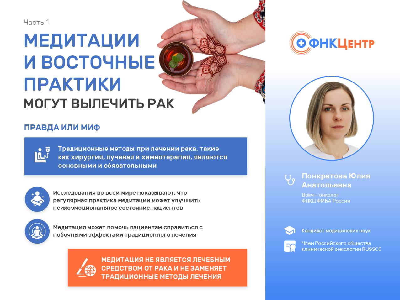 Когда речь идет о лечении рака, традиционные методы, такие как хирургия, лучевая и химиотерапия, являются основными и обязательными. В условиях растущего интереса к альтернативной медицине, включая медитацию и восточные практики, возникает вопрос о их реальной помощи в лечении рака. Действительно ли в них есть польза – рассказывает врач ФНКЦ ФМБА России. Правда заключается в том, что медитация направлена на снижение стресса и улучшение общего самочувствия. Исследования во всем мире показывают, что регулярная практика медитации может улучшить психоэмоциональное состояние пациентов. Это особенно важно, поскольку стресс и тревога могут негативно воздействовать на иммунную систему и, следовательно, на процесс выздоровления. Медитация может помочь пациентам справиться с побочными эффектами традиционного лечения, такими как усталость и тревожность. Тем не менее, она не является лечебным средством от рака и не заменяет традиционные методы лечения.