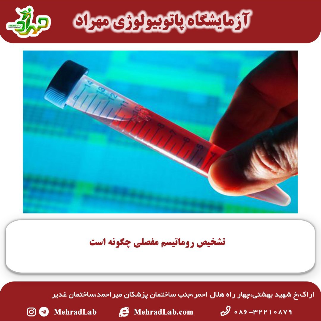 🔹تست بررسی پروتئین خاصی در خون به نام RF که در دو سوم بیماران مبتلا به روماتیسم مفصلی مثبت میشود. البته این آزمایش در یک بیستم افراد طبیعی هم مثبت میشود پس وجود آن علامت قطعی وجود بیماری نیست. تست آزمایشگاهی جدیدتر برای این بیماری بررسی وجود آنتی بادی خاصی در خون به نام CCP است که بیشتر از تست قبلی اختصاصی بیماری روماتیسم مفصلی است.