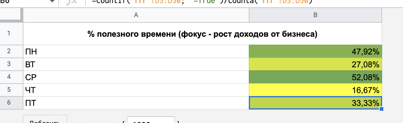 На картинке в низу поста скриншот моего «слепка недели». На нем видно, что самый продуктивный день был в среду (52% продуктивных часов), самый непродуктивный в четверг (16% продуктивных часов), а в среднем получается 35% 😳