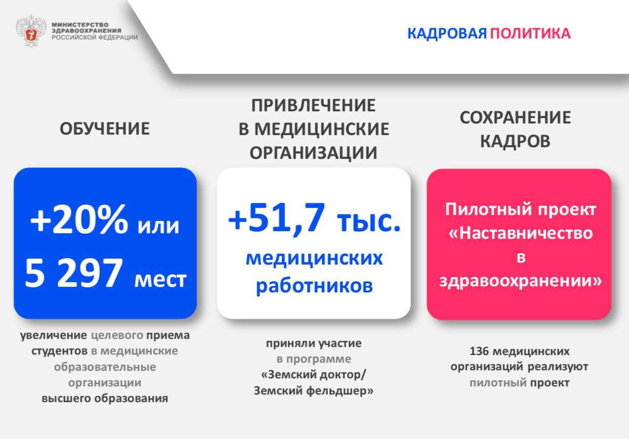 • Также нельзя забывать и о программах «Земский доктор» и «Земский фельдшер», в рамках которых медработники, прибывшие (переехавшие) на работу в сельские населенные пункты, либо рабочие поселки, либо поселки городского типа, либо города с населением до 50 тыс. человек, могут получить компенсационную выплату до 500 тыс. рублей (фельдшеры) и до 1 млн рублей (доктора). Это очень нужные стране программы, и их, конечно, минздрав планирует и дальше развивать.
