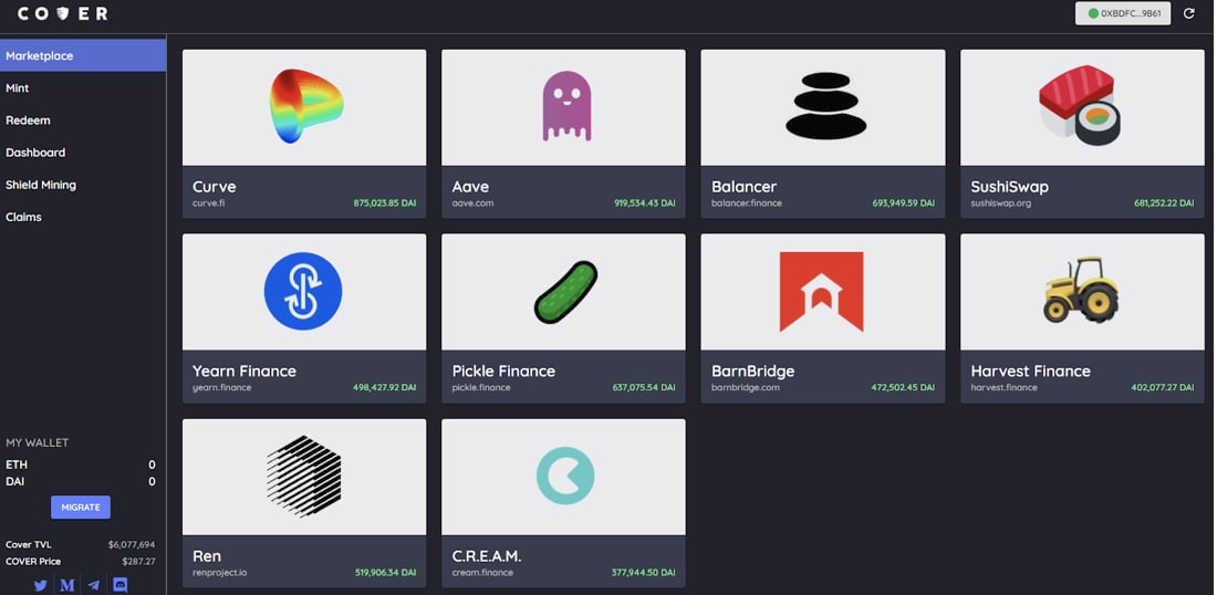 Протоколы, которые в настоящее время могут быть застрахованы: Aave, Balancer, BarnBridge, C.R.E.A.M., Curve, Harvest Finance, Pickle Finance, Ren, SushiSwap и yEarn.