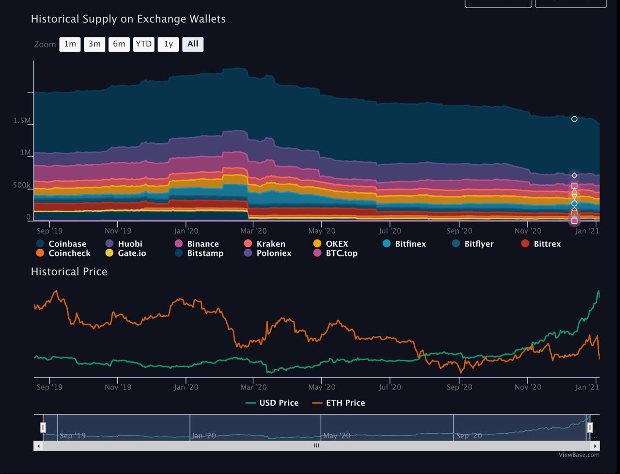 Во-первых, согласно статистике Viewbase 87,954 BTC на сумму более $ 2,8 млрд, покинули централизованные биржи в течение последних 30 дней, только за последние семь дней с бирж вывели 72 727 BTC.