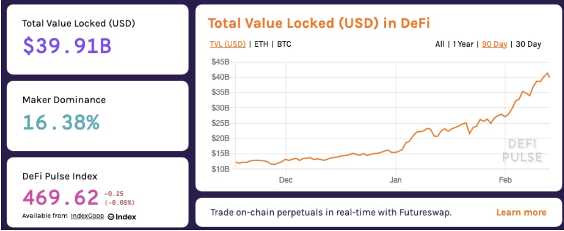 ➕ После роста на $7 млрд с $28 млрд до $35 млрд на прошлой неделе, общая заблокированная стоимость DeFi (TVL) выросла еще на $4,9 млрд долларов до своего текущего исторического максимума в $39,91 млрд долларов. Темпы роста в последнее время просто невероятные!
