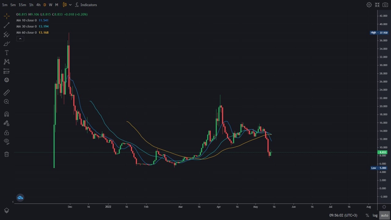 Сейчас токен упал, как и все криптовалюты. Поэтому по 8$ брать не супер больно. Я попробую взять на 2-3% от депозита. По графику вообще можно понять, как развивается проект. Всё зависит от продвижения по roadmap. Точно также развивались Calo Run, у них график с такими "качелями" был.