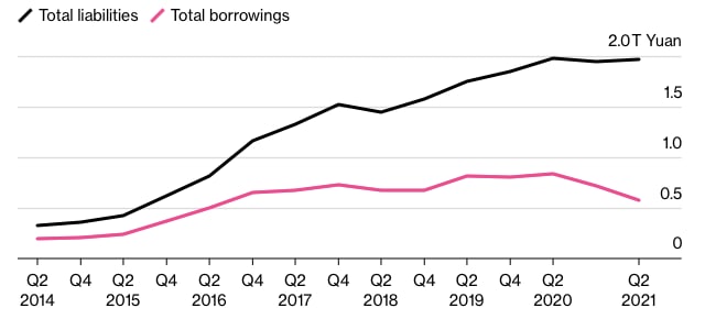 на фото показан значительный рост кредиторской задолженности до 951 млрд юаней ($147 млрд) на фоне снижающегося размера долга до 572 млрд юаней
