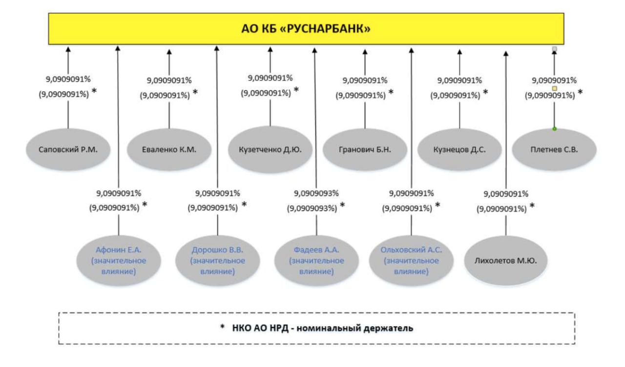 Московский Кредитный Банк продал автокредитный РусНарБанк 11 физ. лицам, доля каждого не превышает 10% - на банковском сленге такая схема называется "футбольной командой". Среди новых акционеров оказались члены совета директоров Руснарбанка - Афонин, Дорошко, Ольховский, Фадеев.