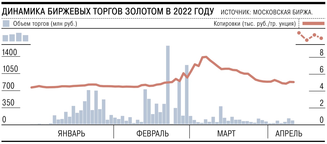 🏛По итогам 2021 года объем торгов на рынке драгоценных металлов Московской биржи составил 209,2 млрд руб. (48,5 тонн золота и 40,2 тонн серебра). В марте-апреле 2022 объемы упали и редко превышают 100 млн руб. в день. По данным Ъ, оживлению торгов помог рост стоимости золота в конце февраля до 8 тыс. руб. за грамм. Однако дальнейшая коррекция и стабилизация курса в районе 5 тыс. руб. за грамм вновь снизила интерес инвесторов.