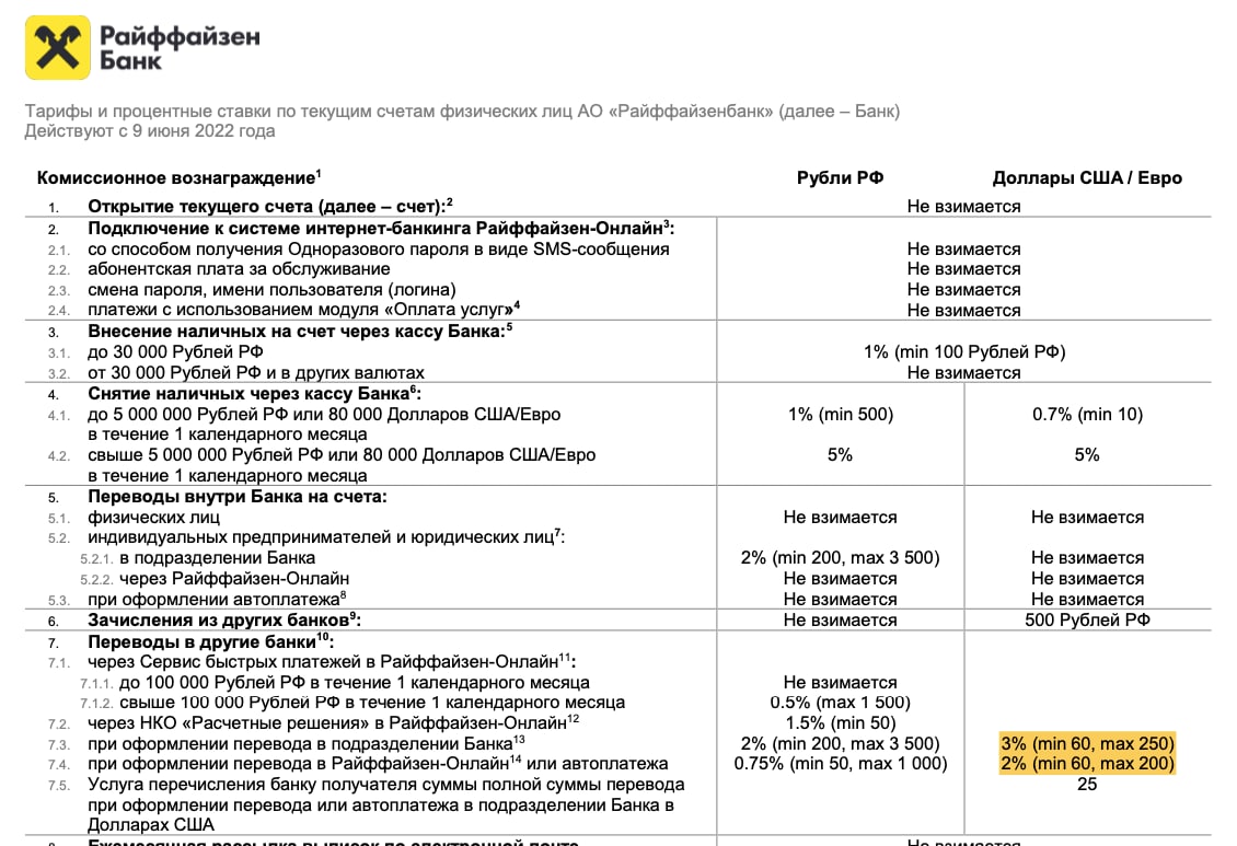 ● с 1 июля для долларовых счетов с остатком свыше $300 000 вводится комиссия 0,9%
