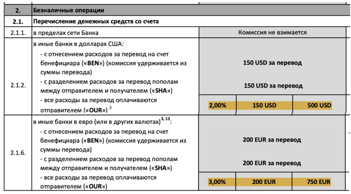 • 3% min 12000₽ max 60000₽ за вывод USD/EUR в другие банки - было для EUR 1,5% min €500 (с 6.06), для других валют - 0