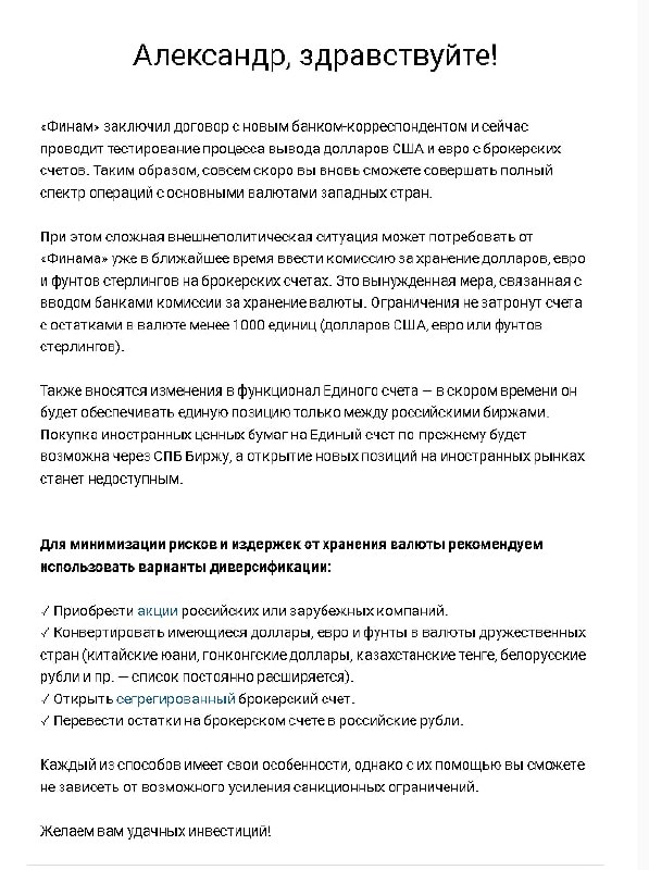 Также Финам сообщает, что открыл корреспондентский счет в USD и EUR в новом банке и сейчас проводит тестирования вывода валюты с брокерских счетов. Скоро ожидается возобновление вывода основных валют западных стран.