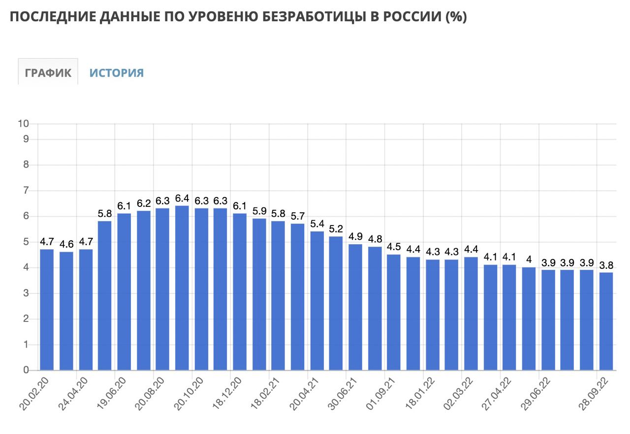 На графике - сегодня уровень безработицы в стране находится на самых низких уровнях, что в текущей ситуации может свидетельствовать о несоответствии картины статистики реальному положению дел. Данные 28.09.2022 - на август 2022