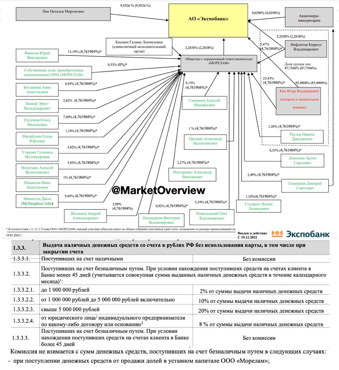 Морелам - это компания топ-менеджеров группы Экспобанка, которой принадлежит 2,2638% акций банка. На фото - схема акционеров банка и компании Морелам, актуальная на 19.01.2022. Специально для акционеров Экспобанк ввёл индивидуальные тарифы.
